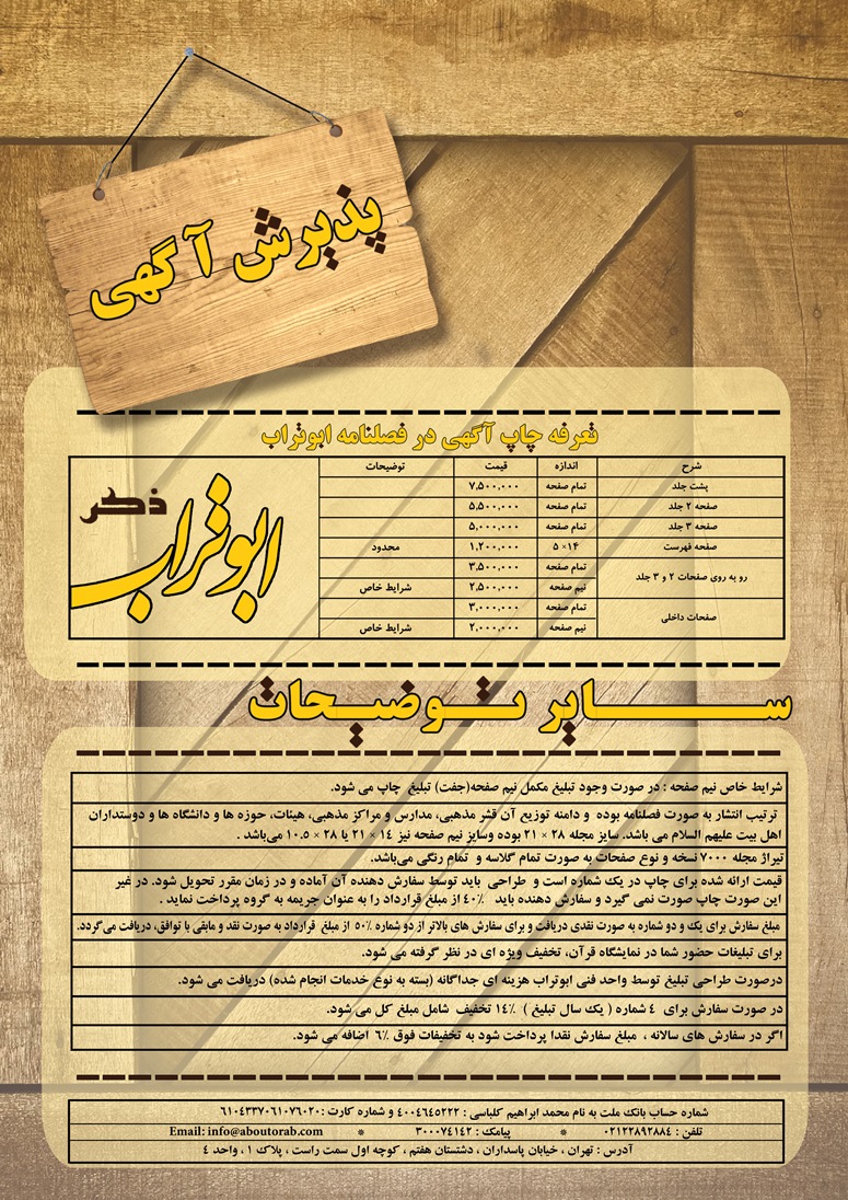 تمامی کالاها و خدمات فروشگاه، حسب مورد دارای مجوزهای لازم از مراجع مربوطه میباشند و تمامی حقوق برای مؤسسه ارمغان نگاه ژرف محفوظ می باشد. فعالیتهای این سایت تابع قوانین و مقررات جمهوری اسلامی ایران است. استفاده از مطالب سایت بلا مانع می باشد، در صورت تمایل سایت ابوتراب را به عنوان منبع ذکر نمایید تا افراد بیشتری با سایت امیرالمومنین علیه السّلام آشنا گردند.